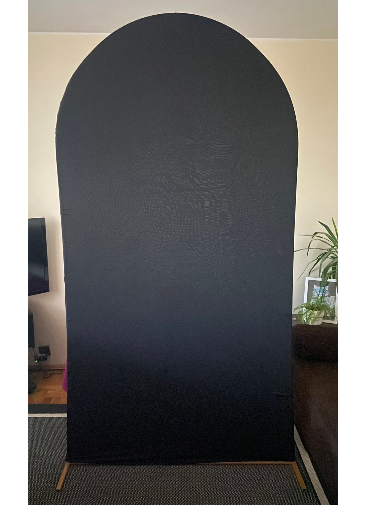 Na wynajem ścianka materiałowa: stelaż łukowy + elastyczny materiał czarny.